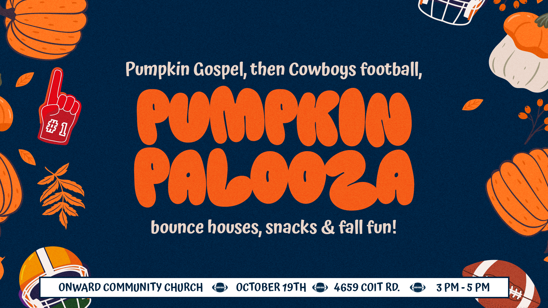 We’ll kick off with Pumpkin Gospel—a creative way to share the gospel while carving pumpkins (don’t forget to bring your own pumpkin and carving tools!)—then stick around for a Cowboys Watch Party, bounce houses, snacks, and family fun. It’s the perfect event to invite your kids, family, and friends to enjoy together!